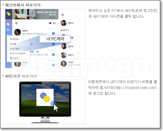 어떤 장소의 PC에서도 웹사이트(http://rsupport.nate.com)에 접속 후 ‘원격제어하기’ 메뉴에서 원격연결할 PC를 선택하여 ‘원격제어’ 버튼 클릭하면 끝! 단, 등록한 PC가 켜져있고 인터넷에 연결되어 있어야 연결 가능 합니다.