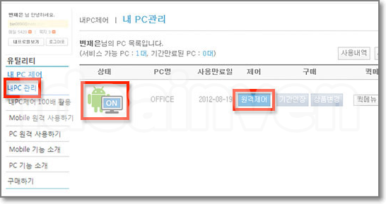 ① 내PC제어 서비스 로그인 후 제어할 PC에서 ‘원격제어하기’메뉴로 이동합니다.