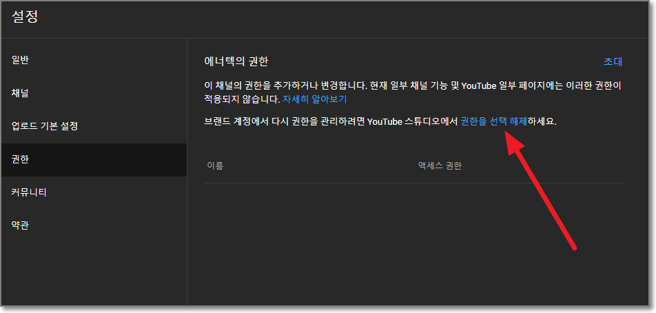 유튜브 스튜디오 "권한을 선택 해제"