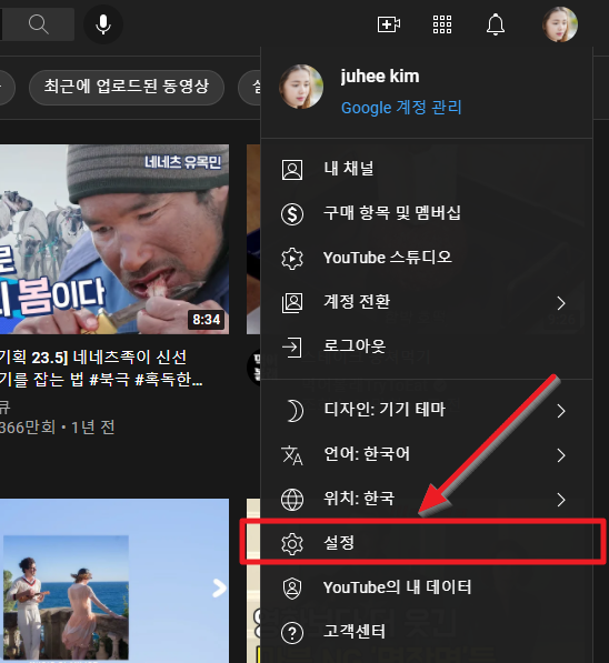 프로필을 누르면 나오는 드롭다운 (Drop Down) 메뉴에서 톱니바퀴 모양의 "설정"을 누릅니다.