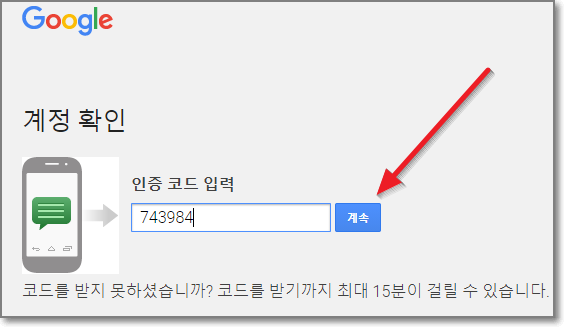 전화로 문자인증은 실제로는 15초 안에 옵니다. 인증코드를 입력하고 "계속"을 누릅니다.