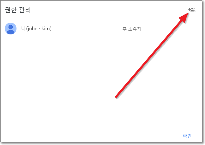 권한 관리 화면에는 "나"만 "주 소유자"로 되어있을 것인데요. 여기서 우측 상단에 사람 추가 아이콘을 누릅니다.