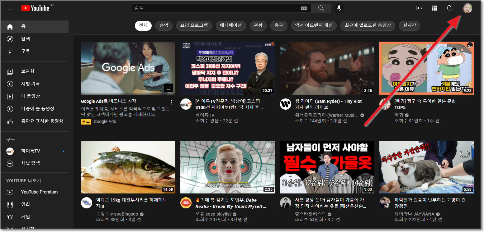 이미 메인 채널이 있는 상태에서 추가로 채널을 만들고자 하는 경우부터 알아보겠습니다. 아래처럼 유튜가 열린상태에서 우측 위에 있는 프로필을 누릅니다.