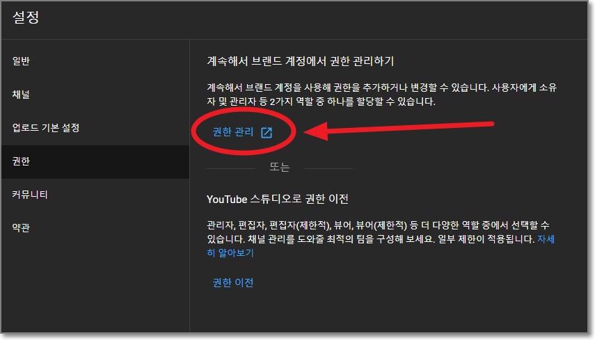 "권한관리"라는 단어가 안 나오고 아래처럼 나오는 경우가 있는데요. 이 상태는 유튜브 스튜디오가 관리하고 있다는 말입니다. 이상태에서는 권한 관리가 제대로 안되므로 유튜브 스튜디오에서 "권한을 선택 해제"해야 합니다.