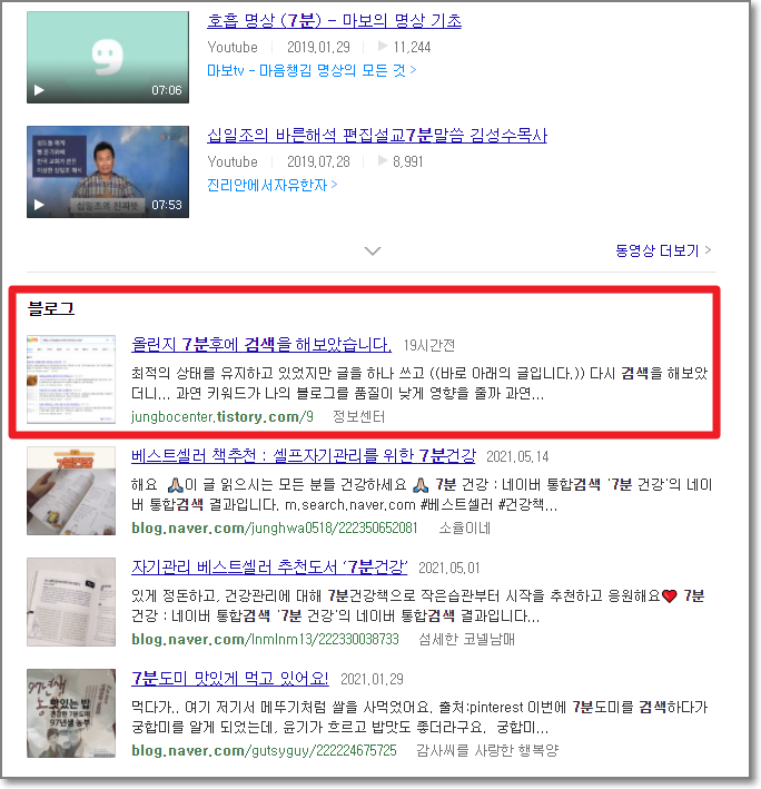 일단 7분, 검색 이라는 키워드 조합으로 검색하면 "사이트", "동영상", "블로그"순으로 나옵니다.