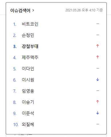 비트코인이 1위, 손정민, 강철부대, 제주맥주, 이다인, 이시원, 임영웅, 이승기, 이준석, 외질혜가 10위까지 차지하고 있는데요.